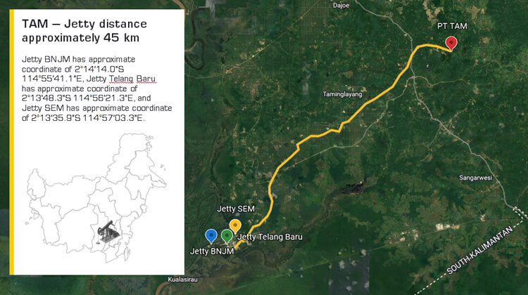 Located in East Dusun, East Barito, Central Kalimantan with the size of the concession is 1,666 Ha. The distance TAM to Banjarmasin, South Kalimantan Province's capital city, is around 225 kilometres (about 143 miles) and little over 309 kilometres (just under 200 miles) to Palangkaraya, the capital of Central Kalimantan.
